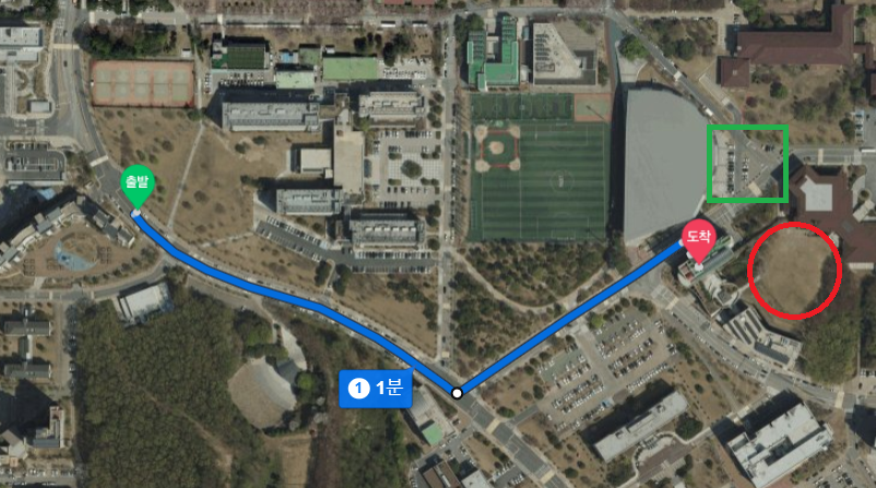 출발지가 카이스트 후문 도착지가 정문술빌딩이예요. 초록색 표기된 곳이 주차장, 빨간 동그라미가 벚꽃 스팟입니다!