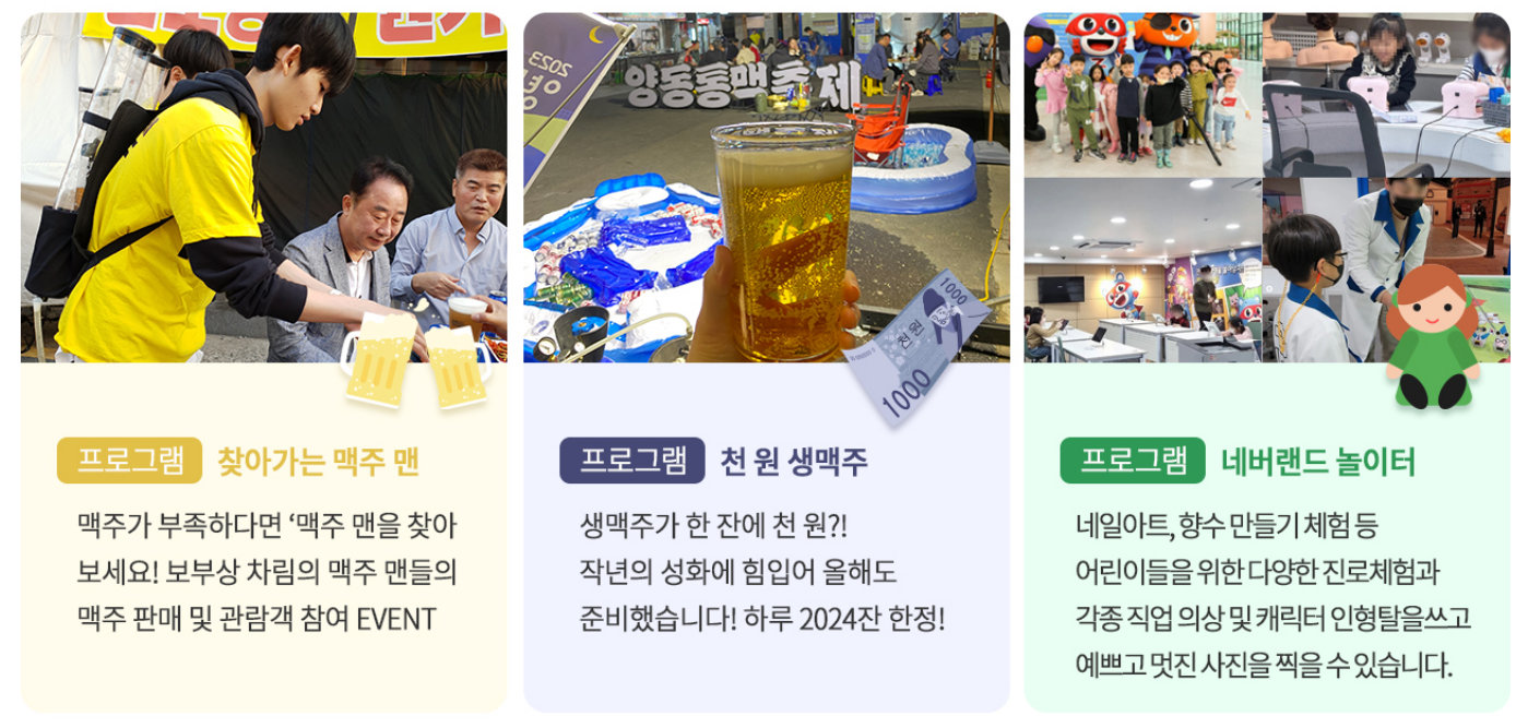 ✅ 메인프로그램 : 전통시장 미식투어 in 양동(개막식), 천 원 생맥주(일일한정 2024잔), 이팅존 운영