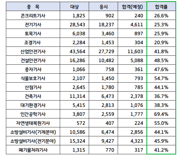 콘크리트 기사 26.6% 합격률, 전기기사 25.3% 합격률, 토목기사 25.9% 합격률, 가장 낮은 합격률을 보인 조경기사 20.9% 합격률입니다.