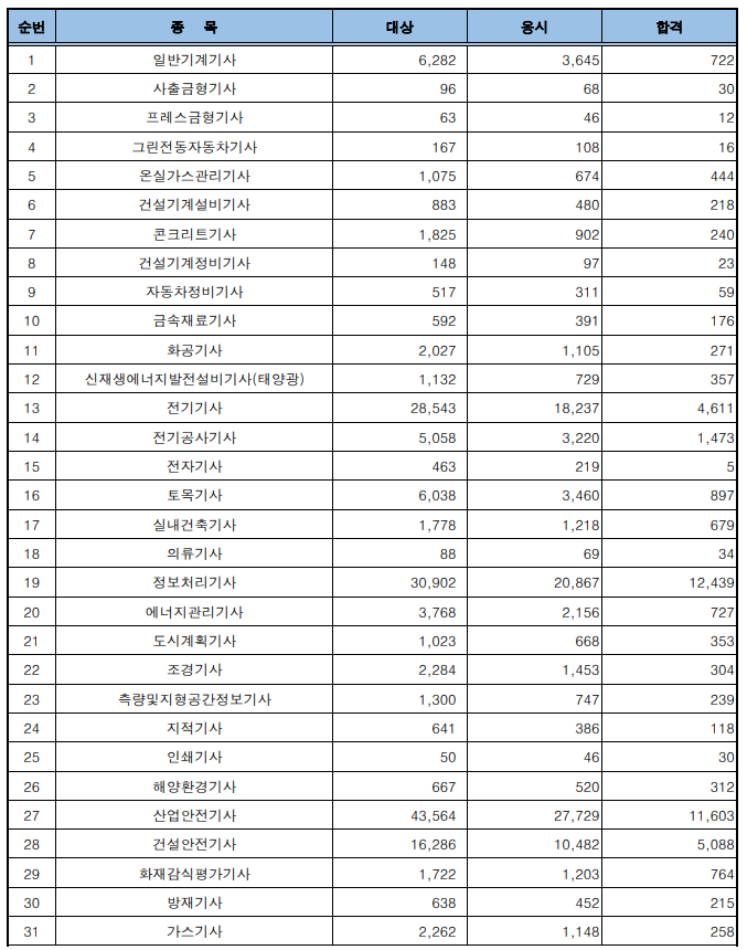 이번글에서는 2024년 정기기사 1회 필기시험 합격률에 대해 알아보도록 하겠습니다. 정기기사 1회 필기 합격자수 오늘 발표된 2024년 정기기사 1회 필기시험 응시자수와 합격자수는 다음과 같습니
