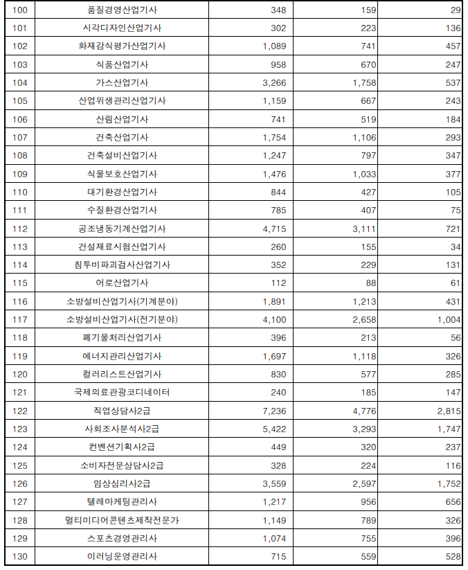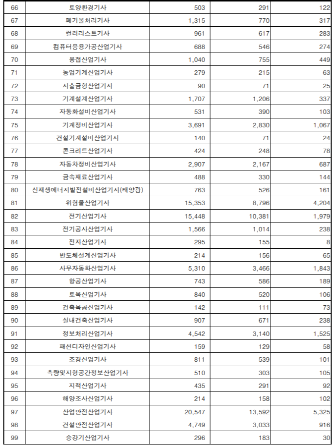 합격률이 높은 종목은 인간공학기사 69.4% 합격률, 자연생태복원기사 55.0% 합격률 등입니다.