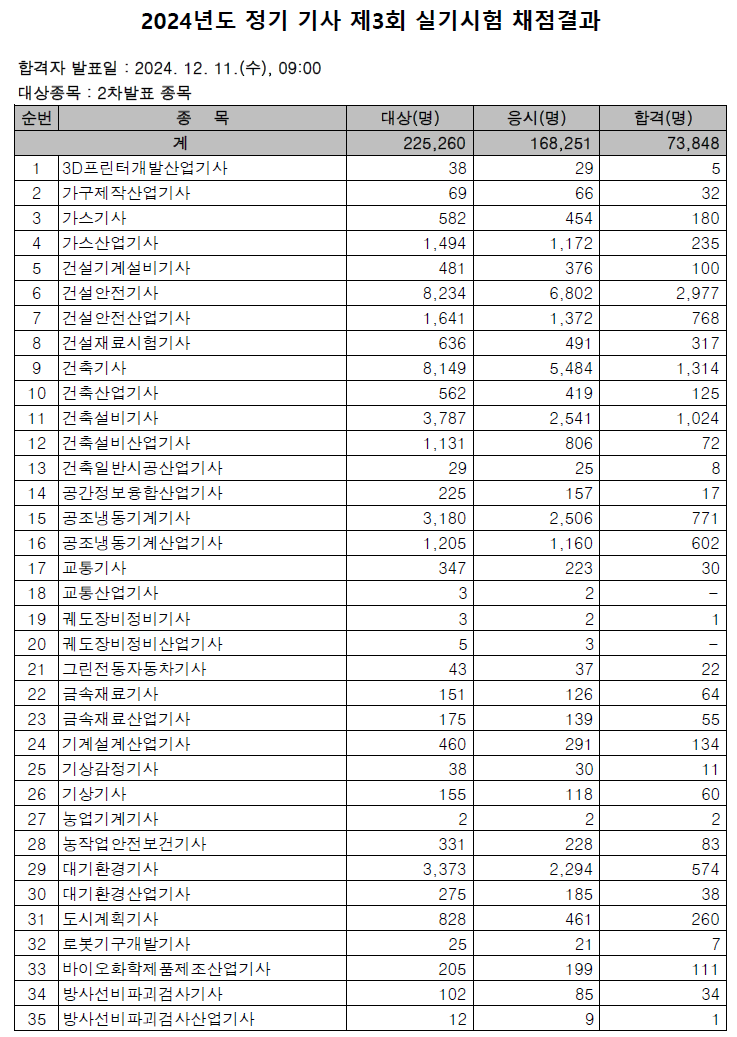 각 종목별 2024년 정기기사 3회 실기시험 합격률은 다음과 같습니다.