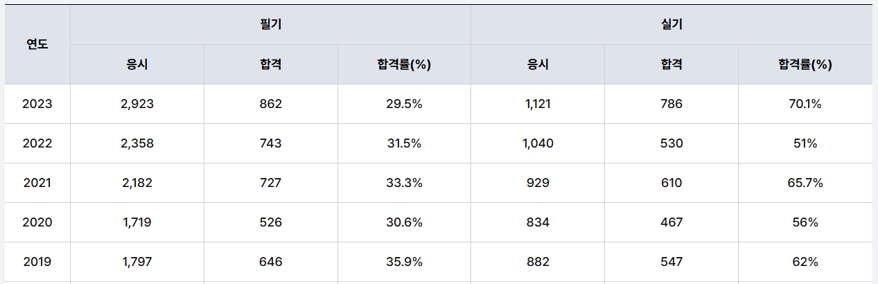 최근 5개년 2023년~2019년 연도별 합격률은 다음과 같습니다.